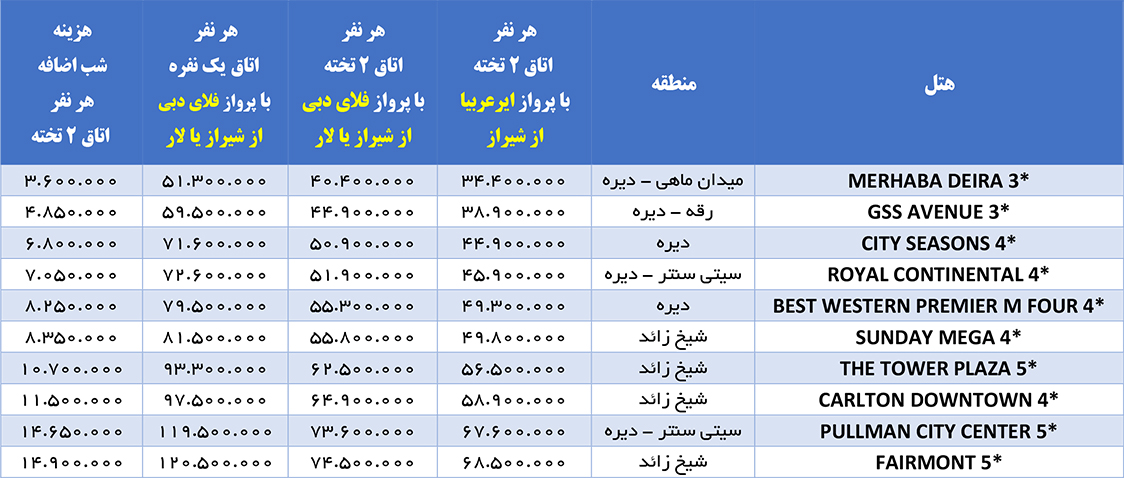 بلیت رفت و برگشت با پروازانتخابی شما از شیراز و همچنین پرواز فلای دبی از لار ، ویزای امارات ( دبی ) ، ترانسفر فرودگاهی ، 3شب هتل با صبحانه ، راهنمای فارسی زبان ، بیمه مسافرتی